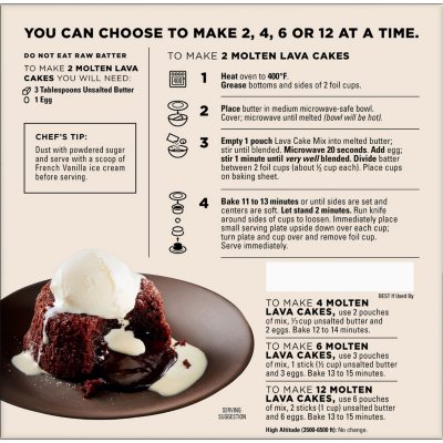 They are individually wrapped in smaller sizes so you can enjoy eating them anytime anywhere. Good for weekend meals desserts. To make 6 Molten Lava Cakes use 3 pouches of mix 1 stick 12 cup unsalted butter and 3 eggs.